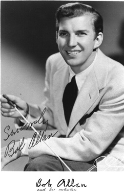 He comes from Allendale, a suburb of Cincinnati and he was studying singing in Cincinnati and working as a soda clerk in a drugstore to pay for his lesson s when Ben Bernie came to Cincinnati’s Palace Theater. Singing with Ben Bernie was a girl who knew Bob Allen, and he went backstage to see her. She told Ben Bernie that Bob could sing and Ben Bernie promptly sent him out on the state, liked him so well that he recommended the youngster to the late Hal Kemp, and for the six years that followed Bob Allen was the featured male vocalist with the Kemp band.